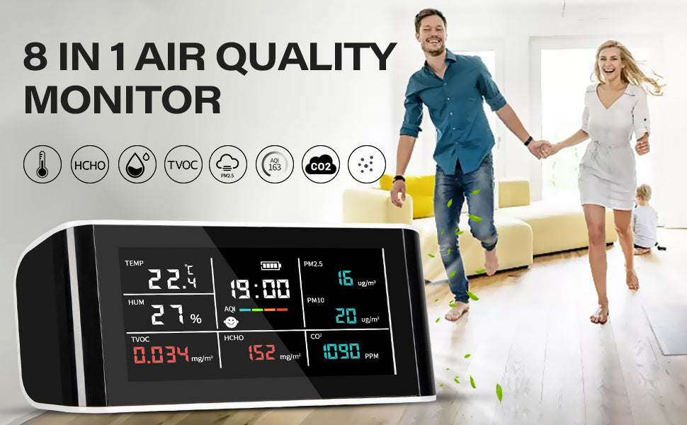 - Multifunktional: Das 8-IN-1-Raumluftqualitätsmessgerät kann Kohlendioxid (CO2), Formaldehyd (HCHO), PM1.0, PM2.5, PM10, flüchtige organische Verbindungen (TVOC), Temperatur und Luftfeuchtigkeit messen.